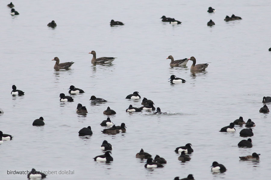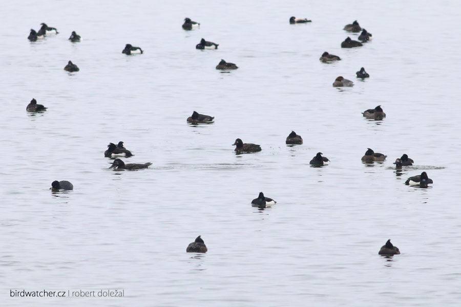 Běločelky, chocholačky, lysky, turpani hnědí a hohol u hráze nedaleko Brodu nad Dyjí.