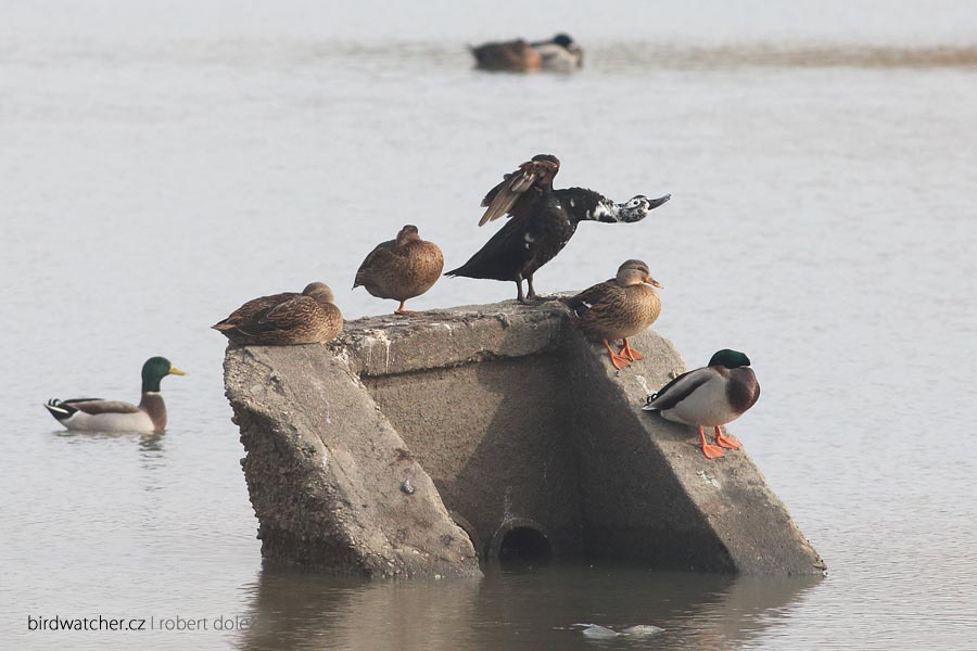 Na chvilku se zastavujeme u Křenovského rybníka, ale nic zajímavého tu není. Pak přejíždíme k pískovně u Troubek. Na kachny v dáli si musím vzít stativák. Nejsou to jen kachny divoké, těch je stovka, ale početní jsou i lžičáci (36 ex.), vidět jsou typické siluety hvízdáků (6 ex.) a dost daleko se pohybuje skupinka dvanácti morčáků velkých. Skoro bych řekl, že je to rodinka letošních mláďat. No a plovoucí ostrůvky se ježí černými těly kormoránů.