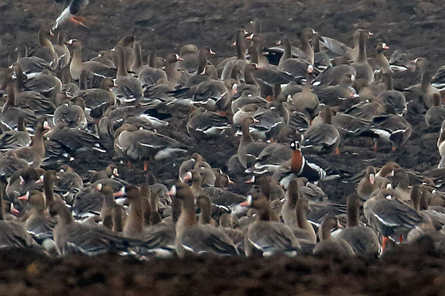 Celý víkend je poměrně teplo, mlhavo a panuje téměř bezvětří. Webové kamery ukazují pod Pálavou ucházející dohlednost, nejedná se o neprostupnou bílou tmu, proto se tam vyjíždím podívat. Zhruba v úrovni Nové Vsi zaznamenávám na poli vlevo od silnice pasoucí se husy. O další půldruhé hodince je tedy rozhodnuto. Sjíždím ze silnice a dobře známou odbočkou se dostávám ke kraji pole. Husy jsou zrovna ve vzduchu. Něco je vyplašilo. Jejich podstatná část se ale vrací a sedá za terénní vlnu. Nejsou daleko, proto musím být opatrný. Část jich stále zůstává skryta, ale už se přibližovat nebudu, aby mi nezamávaly křídly. Prohlížím je stativákem tam a zpět. Drtivou většinu tvoří běločelky. Hus velkých je tu snad jen do desíti. Po menších skupinách se vrací část hejna, která před chvílí odletěla. Nakonec před sebou mohu mít asi 10000 ptáků. Někteří pospávají, jiní se pasou. Vlhká hlína se jim lepí na nohy. Až při čtvrtém přejezdu stativákem nacházím bernešku rudokrkou. Teď se zdá být nápadná, ale stačí, aby se přikrčila, dala si šlofíčka nebo se před ni postavily běločelky, a není po ní ani památky. Nenápadně se pak vytrácím, abych husám dopřál klid. Ale bylo to krásné pokoukání.