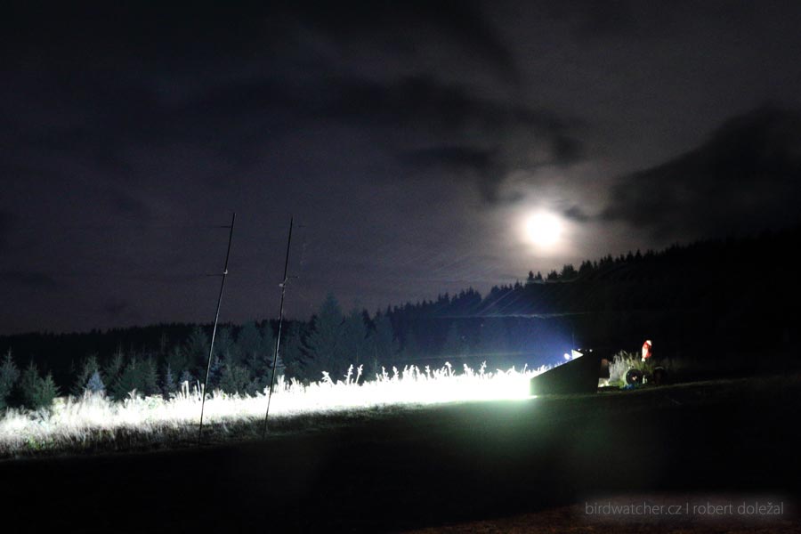 Následovaly dva dny prudkého nárazového severáku provázeného vytrvalým deštěm, ve kterém se sítě nedaly ani natáhnout. Pak vítr polevil, obloha se vyčistila a ukázaly se hvězdy. Světlo reflektoru hned dosáhlo do větší vzdálenosti a prozradilo, že nad Sedlem protahují ptáci – drozdi, kosi, nějaké sluky a hlavně červenky. Vítr postupně utichal a dokonce se změnil na jižní, což obvykle zvětšuje šanci početnějšího odchytu. S rostoucím neklidem jsem pozoroval oblohu a počítal. Každou minutu nad námi jen v dosahu světla protáhlo 70-150 červenek a výše, na horním konci sjezdovky, se občas objevil chuchvalec mlhy. Kdyby klesla níže, byla by to červenková noc jak vyšitá. Prozatím jsme si ale s Frantou libovali, jaký je klid. Kroužkovat jsme s přehledem stíhali, chytla se sluka, pak sýc, noc běžela poklidným tempem pod stále ještě hvězdnatou oblohou a my doufali, že to tak vydrží.